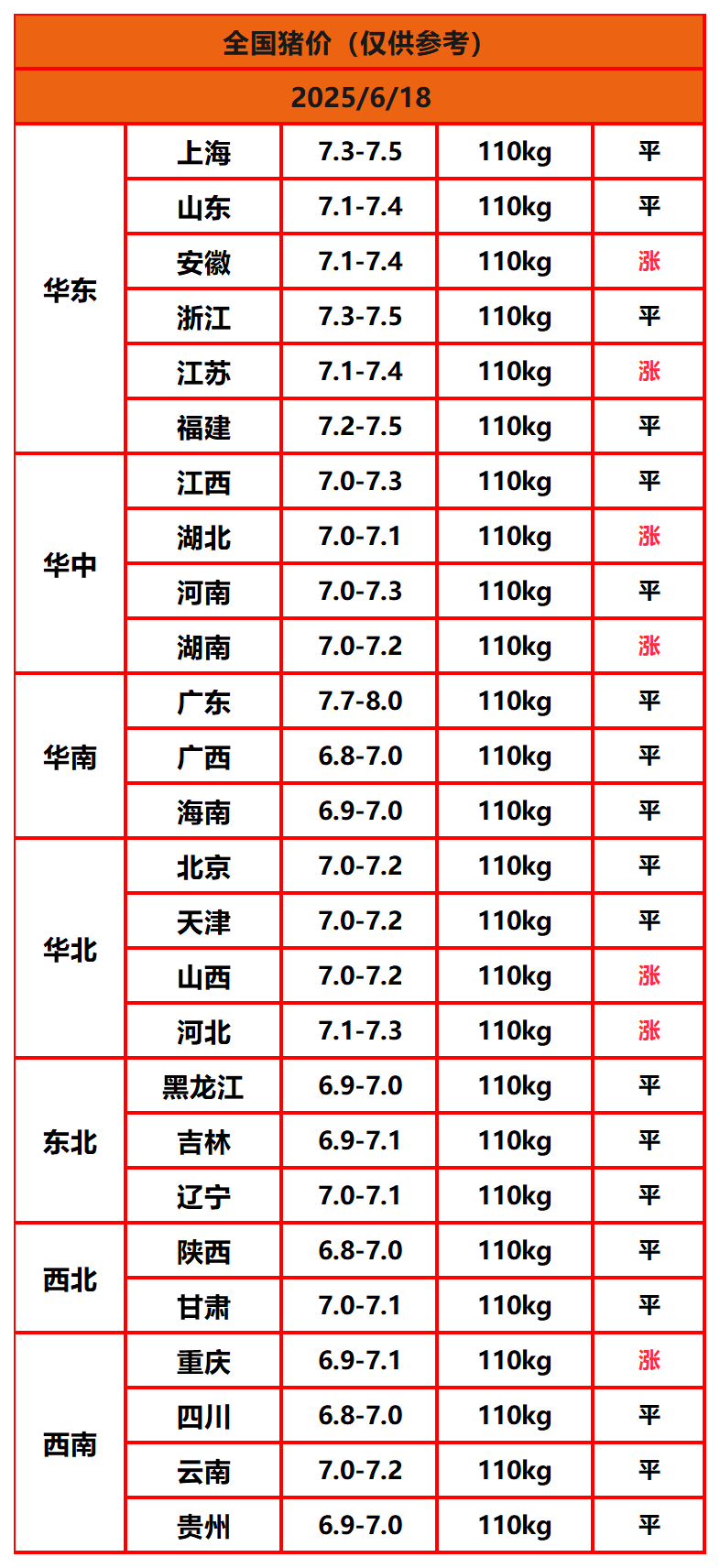 2025年6月18日猪价,今日全国猪价行情走势:7涨19平0跌。