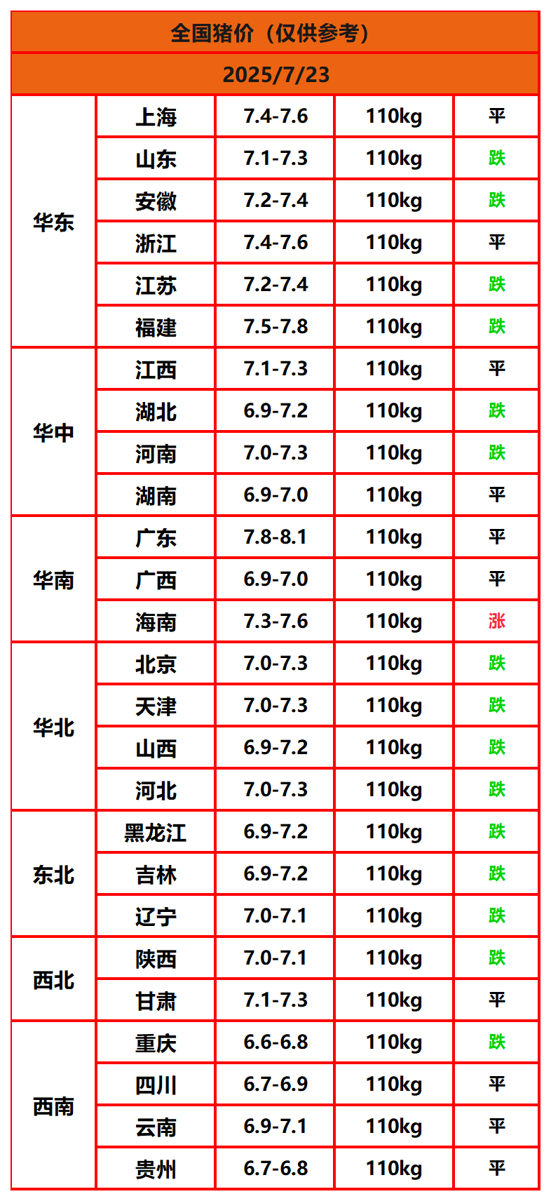 2025年7月23日猪价,今日全国猪价行情走势:1涨10平15跌。